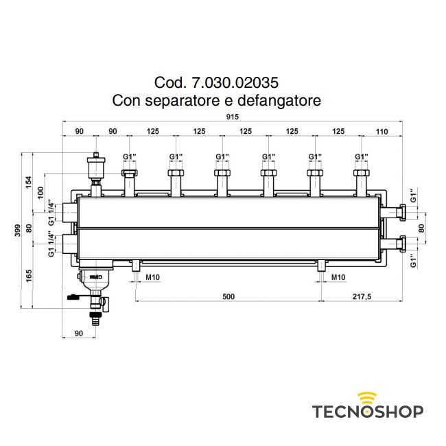 Collettore defangatore/separatore 3+1 (laterale) attacchi principali G 1 ¼ F – attacchi utenze ghiere G 1 F – interasse 125 mm.