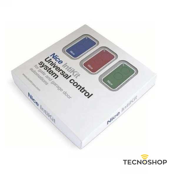 Nice Intikit ricevitore + 3 telecomandi 433 MHz si compone di 3 trasmettitori a 2 canali, 433,92 MHz (rosso, verde e blu) e 1 ricevitore universale precablato a 2 canali.