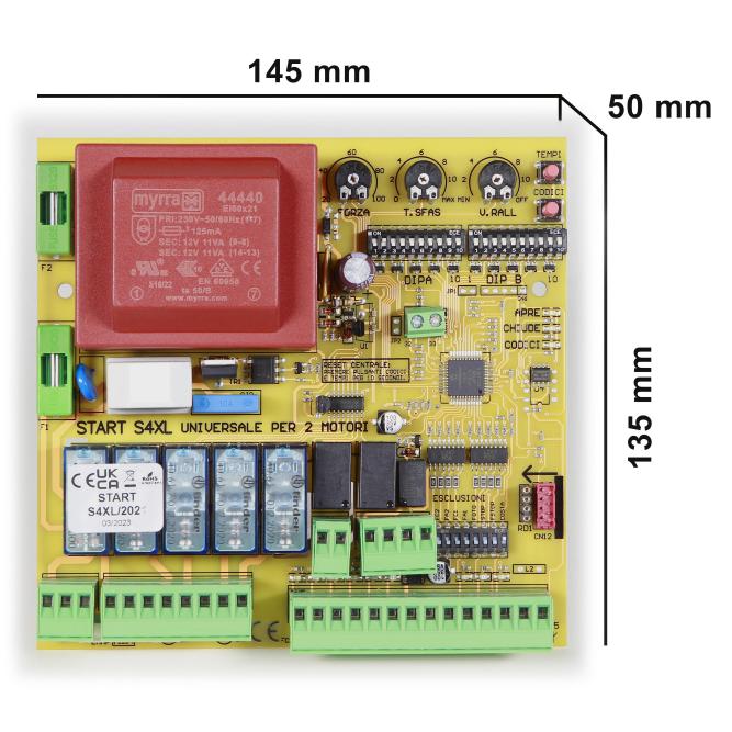 Centrale per motori 230Vac adatta per motori per cancelli/motori per anta/ motori battente/motori scorrevoli. Collegabile ad un attuatore oleodinamico o elettromeccanico dotato di motore asincrono monofase. La radio ricevente 433,92MHz è integrata con gestione codici fissi e rolling-code HCS. Ingressi: start-orologio, foto in ch e ap+ch, doppi fine corsa ap e ch, comando pedonale, stop. Velocità di rallentamento, forza e sfasamento sono regolabili tramite trimmer. I tempi di lavoro sono in “real-time”. Fusibile autoripristinante per ovviare a imprevisti durante l’installazione.