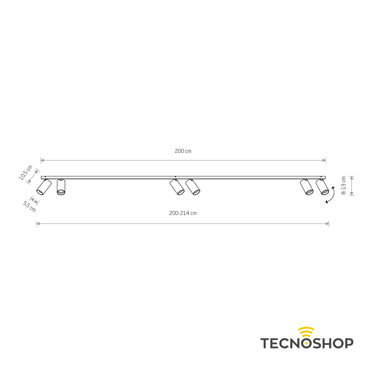 Barra Nowodvorski composta da 6 spot orientabili per lampade GU10 di colore nero opaco e lunghezza 200cm.