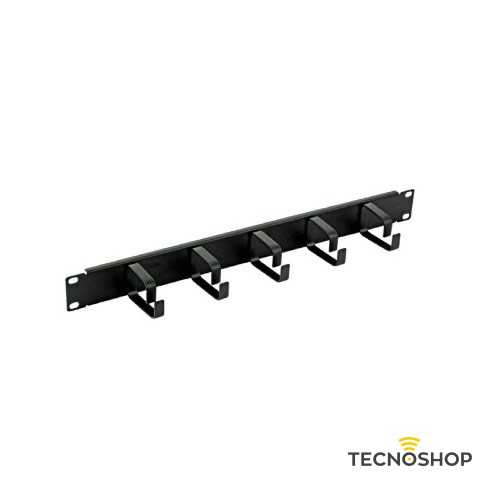 Pannello 19″ 1U guidacavi con 4 anelli in plastica per il cablaggio di armadi rack.