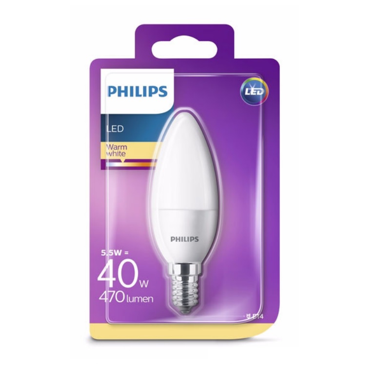 Lampadina LED E14 a forma di candela da 5,5W, equivalente a 40W, luce bianca calda 2700K, flusso luminoso 470 lumen, accensione istantanea, adatta per interni con luce confortevole (Eye Comfort), lunga durata di 15.000 ore.