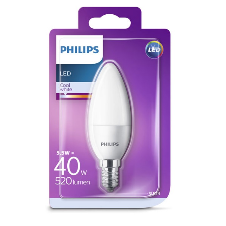 Lampadina LED E14 a forma di oliva da 5,5W, equivalente a 40W, luce bianca fredda 4000K, flusso luminoso 520 lumen, accensione istantanea, ideale per luce soft con comfort visivo (EyeComfort), durata stimata 15.000 ore.
