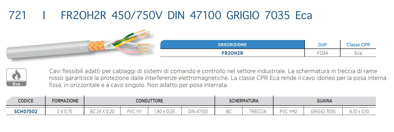 Cavi flessibili adatti per cablaggi di sistemi di comando e controllo nel settore industriale. La schermatura in treccia di rame rosso garantisce la protezione dalle interferenze elettromagnetiche. La classe CPR Eca rende il cavo idoneo per la posa interna fissa, in orizzontale e a cavo singolo.