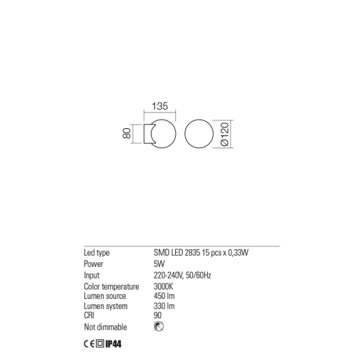• Dimensioni: diametro: 120 mm, distanza dal muro: 135 mm
