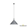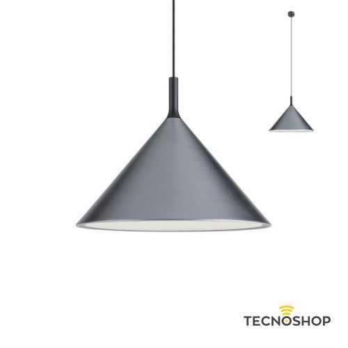 Originale lampada a sospensione dal design elegante, realizzata con base in alluminio nero opaco e diffusore conico in alluminio colore grigio opaco all’esterno e bianco opaco all’interno.