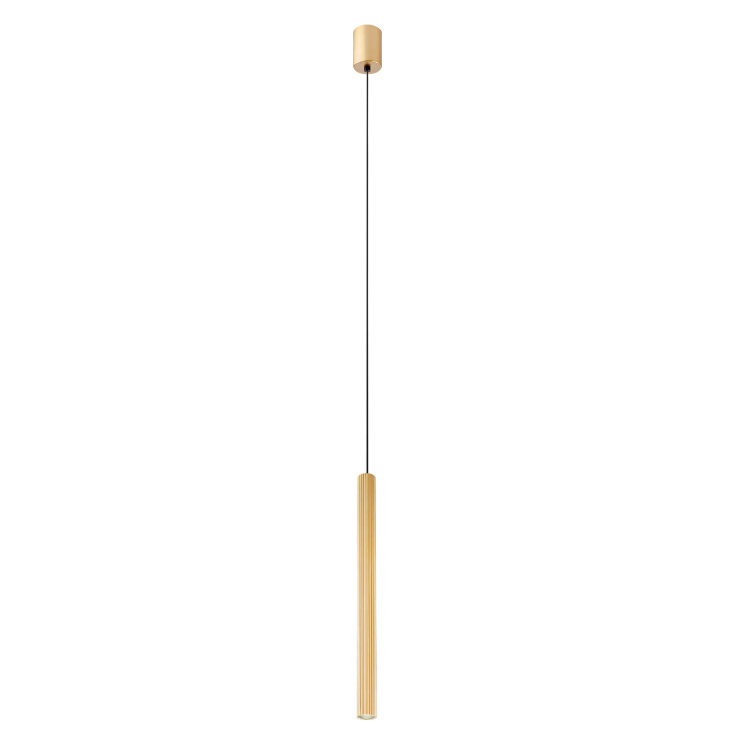 Sospensione per interni equipaggiata con LED COB con corpo in alluminio e metallo verniciato oro opaco. Diffusore acrilico trasparente.