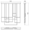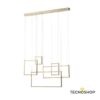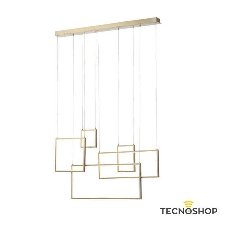 Elegante lampada a sospensione a LED dal design moderno della serie Plana, composta da cinque corpi rettangolari in metallo color ottone opaco e diffusore in acrilico satinato con LED integrato da 80W, 3000K, 8560lm. con distribuzioni luminose indirette.