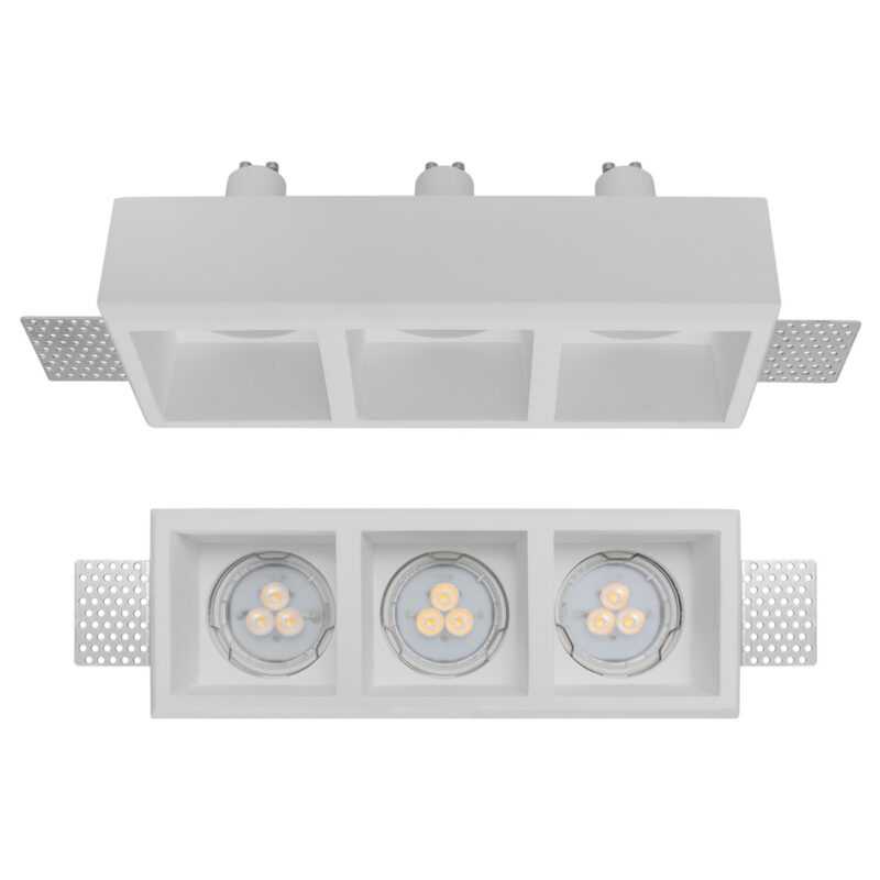 Faretto da incasso fisso con struttura di gesso modello XGESS, forma quadrata da incasso e di riflettori, per tre lampadine a LED, attacco GU10 o per moduli a LED CM03. Posizione retratta delle lampadine per evitare l’abbagliamento diretto. Si installa su controsoffitti in cartongesso, a filo, senza rivestimento del bordo del profilo.