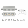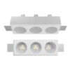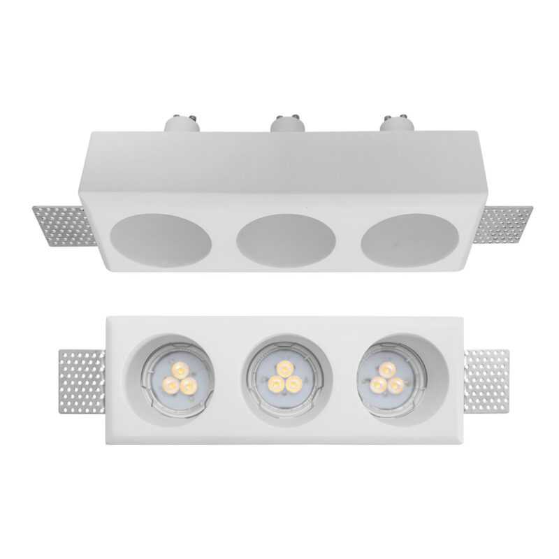 Faretto da incasso fisso con struttura di gesso modello XGESS, forma quadrata da incasso e di riflettori, per tre lampadine a LED, attacco GU10 o per moduli a LED CM03. Posizione retratta delle lampadine per evitare l’abbagliamento diretto. Si installa su controsoffitti in cartongesso, a filo, senza rivestimento del bordo del profilo.