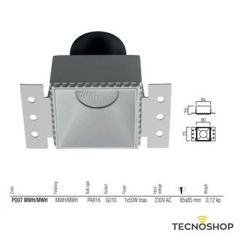 Faretto da incasso quadrato, telaio e anello decorativo bianco opaco, per lampadine a LED, con attacco GU10. Si installa su controsoffitti in cartongesso, a filo, senza rivestimento del bordo del profilo.