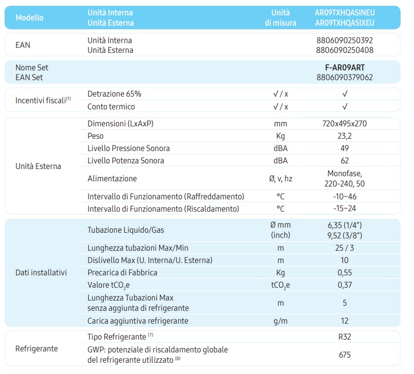 | Nome del prodotto | Samsung Condizionatore Unità Interna AR09TXHQASIXEU 9000 BTU Parte Interna |