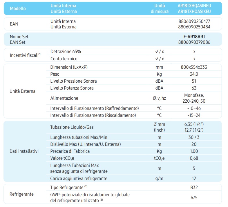 | Descrizione | Unità esterna monosplit Samsung AR35 AR18BXHQASIXEU, gas refrigerante R32, 5.3 kW potenza freddo, 5.3 kW potenza caldo, 51 dB(A) livello rumorosità, 33.3 cm lunghezza, 80 cm larghezza, 55.4 cm altezza |