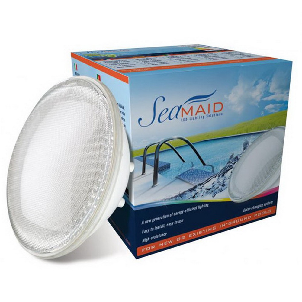 Lampada LED colorata RGB Seamaid 270 per faretti da piscina. Potenza 18W, 400 lumen. Lente resistente agli agenti chimici. Eccellente resa luminosa. Design ottimizzato per la luce. Installazione facile e veloce. Compatibile con faretti PAR56. Colori RGB con programma di illuminazione (fisso o ciclico)