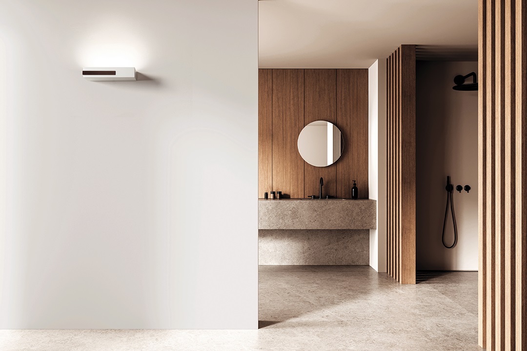 Lampada da parete in gesso per illuminazione indiretta. Elemento in alluminio con finitura bronzo spazzolato.