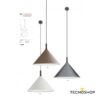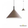 Originale lampada a sospensione dal design elegante, realizzata con base in alluminio nero opaco e diffusore conico in alluminio color caffè sabbiato all’esterno e bianco opaco all’interno.