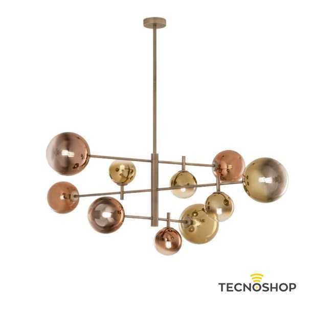 Sospensione per interni, struttura in metallo finitura ottone anticato opaco, diffusori in vetro pyrex con finitura sfumata a specchio oro e caffè.