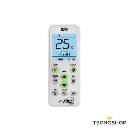 Telecomando universale per climatizzatori con WIFI, gestibile dall’esterno tramite App dedicata sia per iOS che Android, grande display retroilluminato, tasti principali fluorescenti al buio e batteria interna ricaricabile. Comanda tutte le funzioni (MODO, VENTOLA, SWING, DIR). Funziona con tutte le marche. 4 tipi di programmazione: Ricerca immediata per marca, Inserimento diretto del codice, Ricerca automatica, Ricerca manuale. Alimentazione tramite 1 batteria Li-Ion 3,7V-500mAh. Non perde la memoria durante la sostituzione delle batterie. Conmpleto di base e alimentatore.