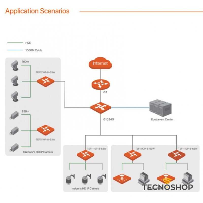 I-SWHUB TEF1110P8 è uno switch PoE non gestito con 2 porte uplink, progettato indipendentemente da Tenda. Conforme allo standard IEEE 802.3at/af, è in grado di identificare in modo intelligente i dispositivi basati su PoE. Lo switch fornisce una potenza PoE massima di 63W e 30W per una singola porta. In primo piano con modalità estesa, funzioni VLAN a una chiave e QoS, TEF1110P-8-63W è la scelta ideale per PMI, supermercati e ristoranti con videosorveglianza di piccole dimensioni.