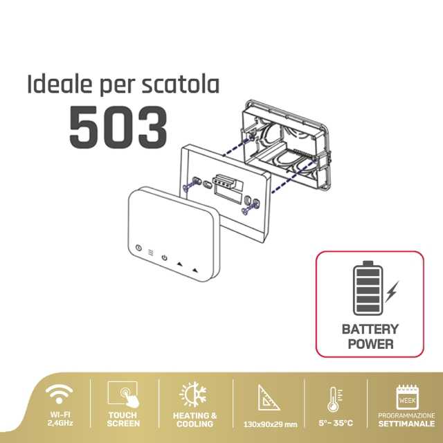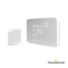 Termostato HEYTHERMO-FREE wireless Zigbee a batterie con pannello soft-toch retro illuminato. Si collega direttamente ai fili della caldaia o sistema di raffreddamento grazie alla doppia funzione HEATING / COOLING.