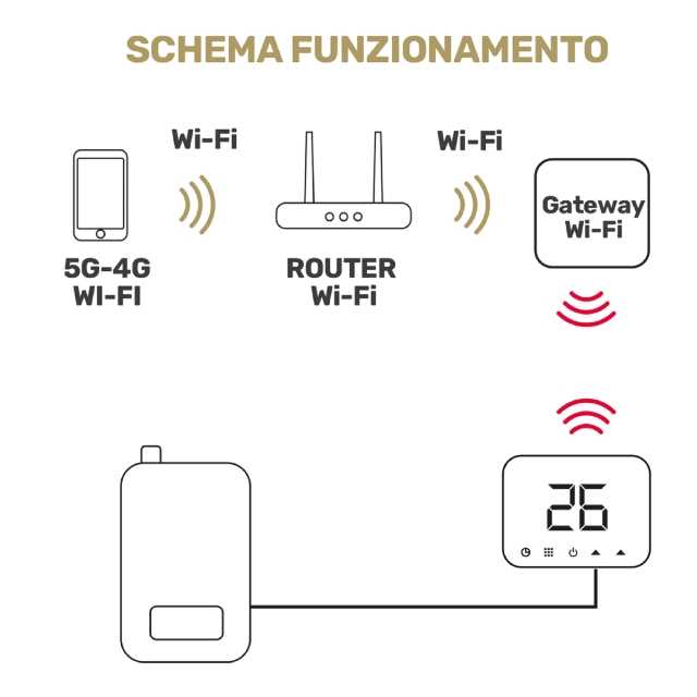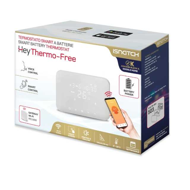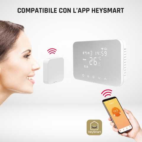 Grazie al suo Hub Gateway (cod. 68.6811.00) fornito in dotazione, è possibile collegarlo al wi-fi e controllarlo da remoto tramite App HeySmart. Il termostato è dotato di relè a contatto pulito che lo rende compatibile con la maggior parte dei termostati.
