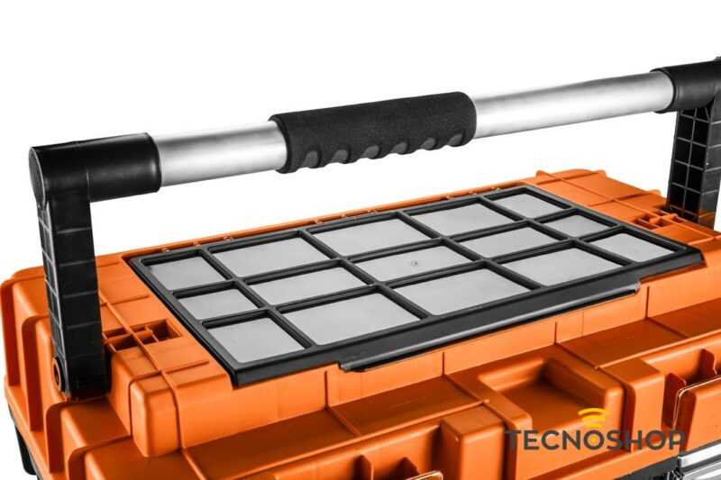 Cassetta degli attrezzi NEO, dimensioni 68 x 40 x 35,5 cm. Cassetta degli attrezzi spaziosa e mobile realizzata in plastica resistente con morsetti in metallo. La cassetta degli attrezzi è dotata di un ampio organizer per riporre piccoli oggetti, vassoio interno e comoda maniglia telescopica per trasportare o trascinare. La cassetta degli attrezzi è dotata di due ruote per la guida. Il marchio NEO soddisfa le aspettative dei professionisti.