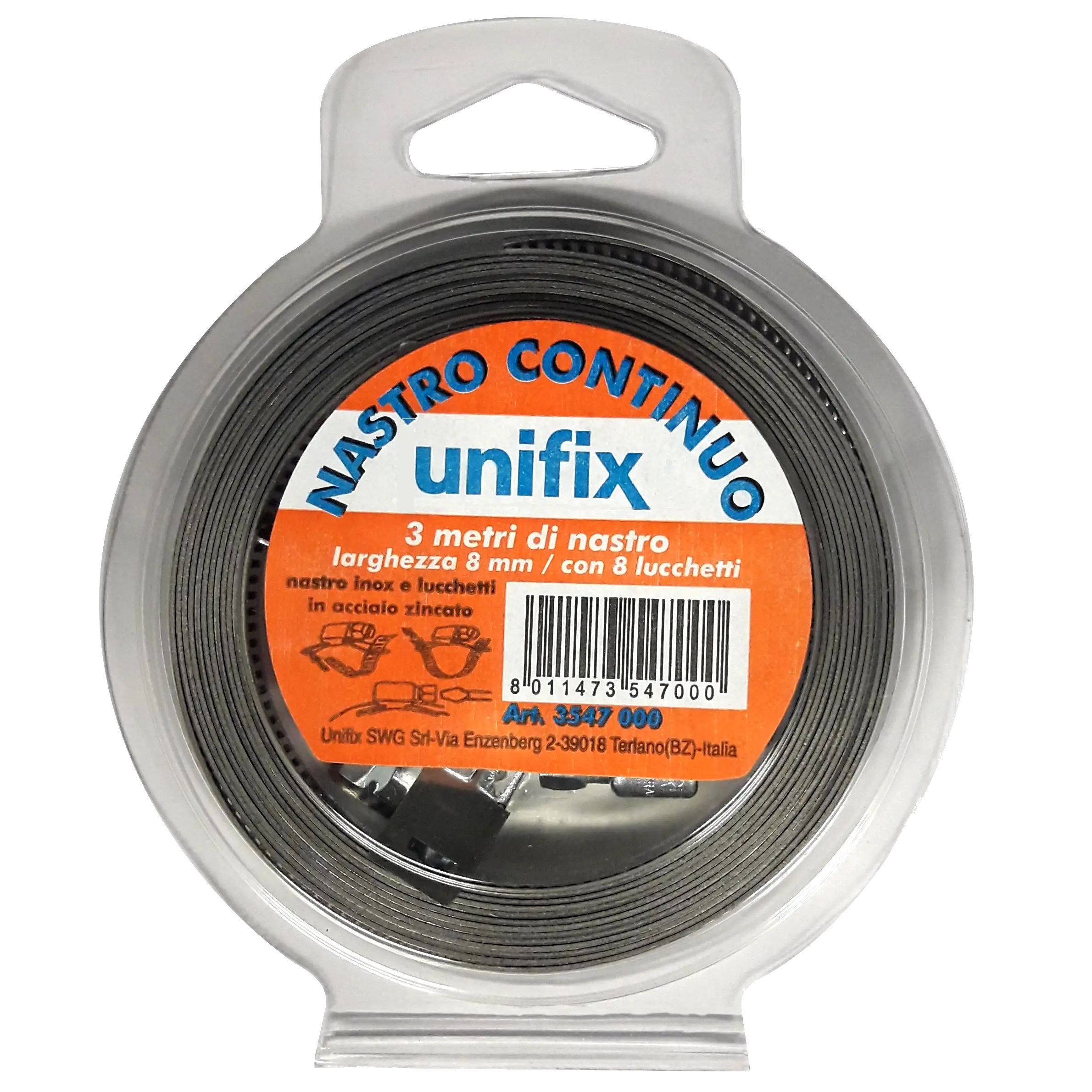 Fascetta a nastro continuo in acciaio inox A2, lunghezza 3 metri e larghezza 8 mm, ideale per fissaggi resistenti e duraturi anche in ambienti esterni.