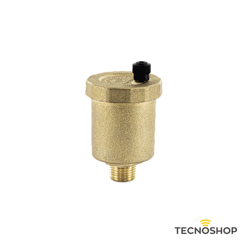 Valvola di sfiato aria automatica compatta per piccoli impianti, completa di nottolino di chiusura manuale. Scarico verticale. Funzionamento a galleggiante.