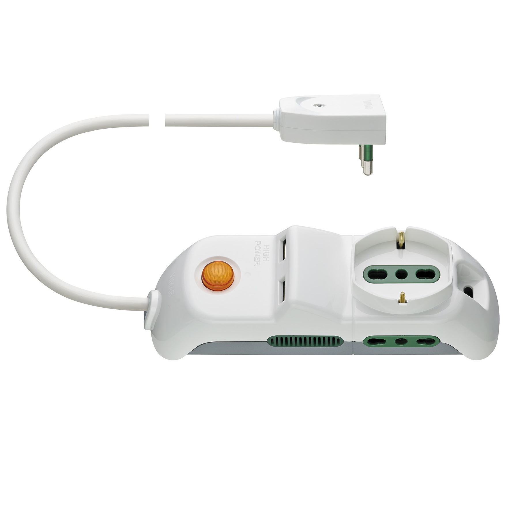 Presa multipla 2P+T da 16 A con 3 prese totali (1 universale P40 + 2 italiane P17/11), interruttore luminoso e 2 porte USB 5 V 2,1 A per la ricarica di dispositivi. Completa di cavo da 1,5 m, spina orientabile ricollegabile e potenza massima 3680 W. Ideale per casa e ufficio. Colore bianco.