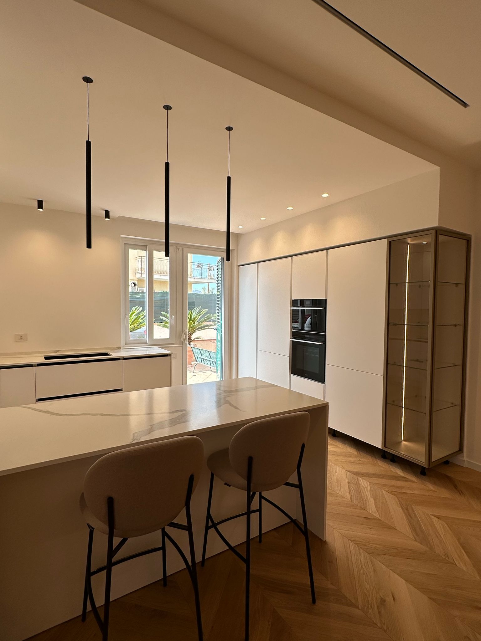 In cucina è stato mantenuto un approccio pulito e minimal, grazie all’utilizzo di incassi in gesso a scomparsa totale, che lasciano spazio a una luce tecnica precisa e funzionale.